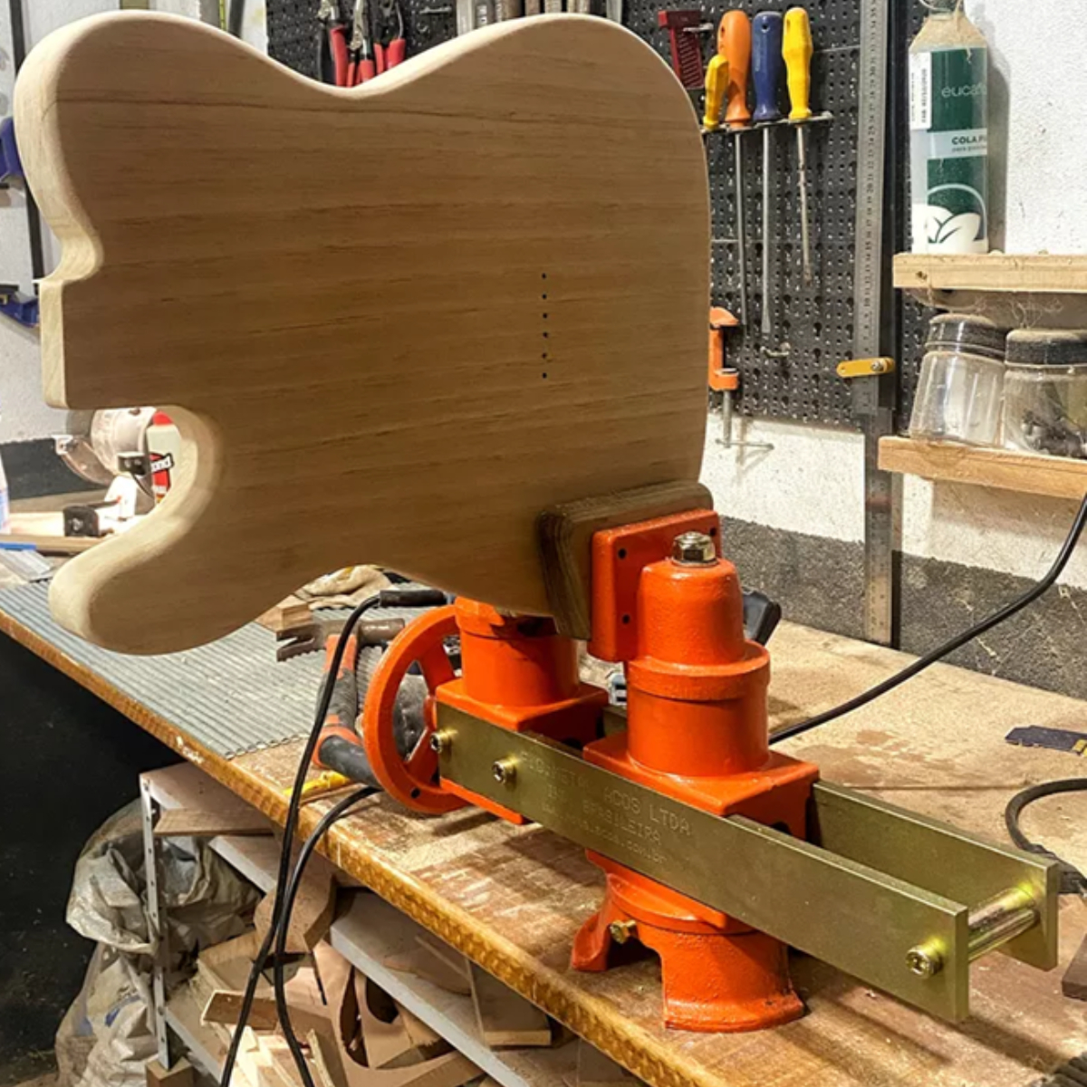 Basta fazer um furo com diâmetro de 19mm passante, onde a morsa será utilizada, encaixar o fuso inferior da base e montar a arruela lisa e a porca borboleta.