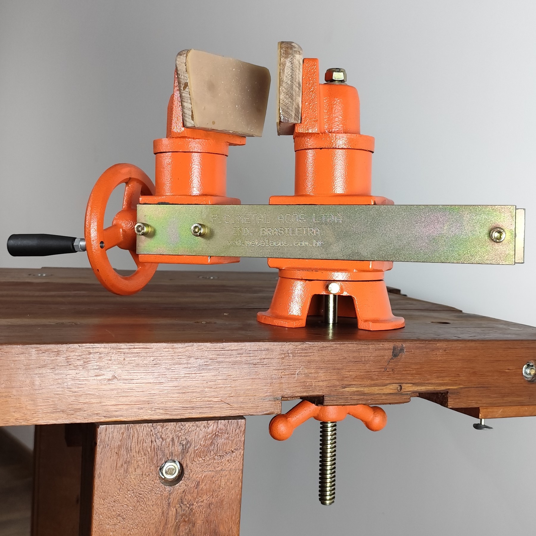 - Mordentes de madeira, com espessura de 20mm, revestido com pulsômetro de borracha, reforçado de 4mm, para segurar os instrumentos sem danificar a superfície.